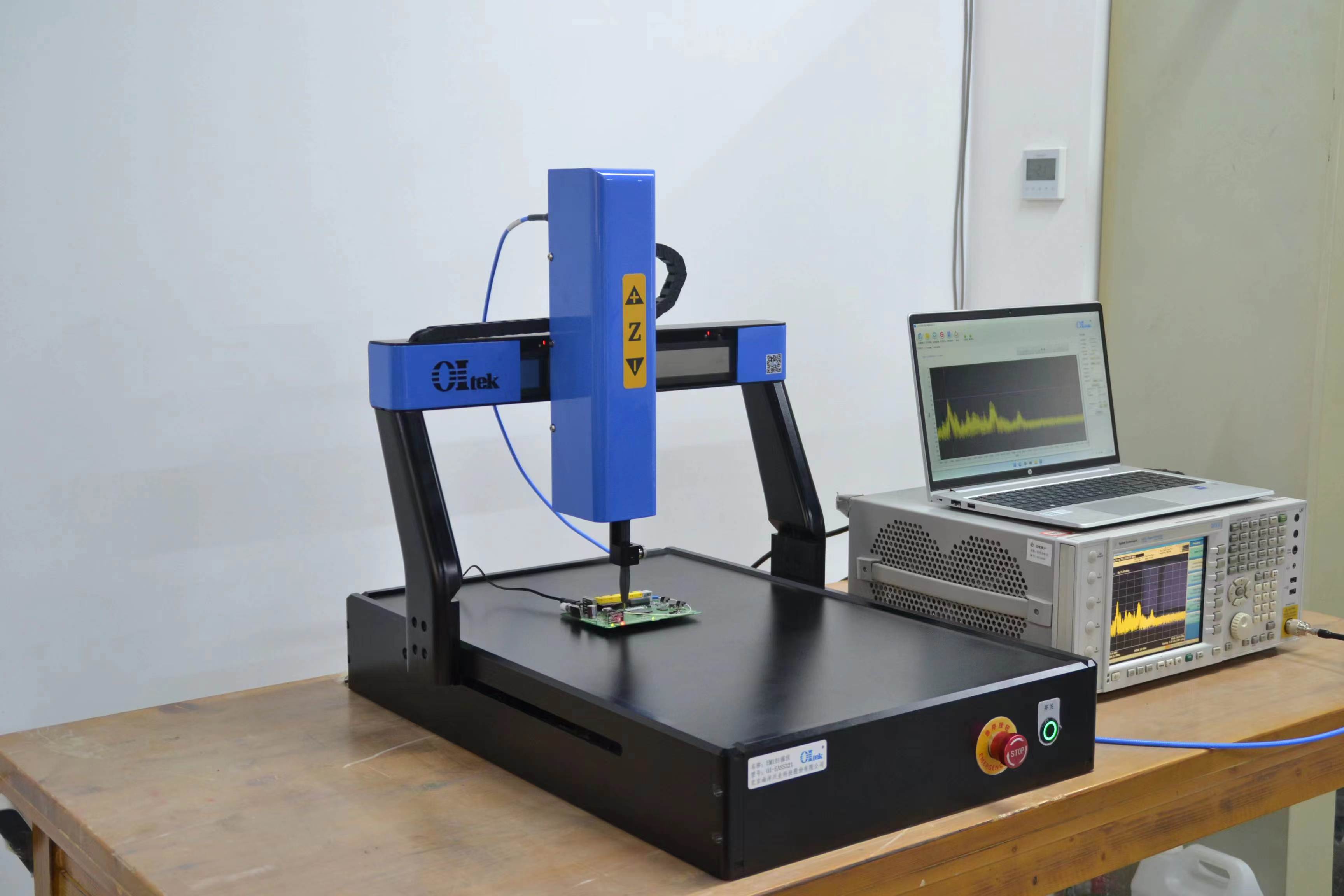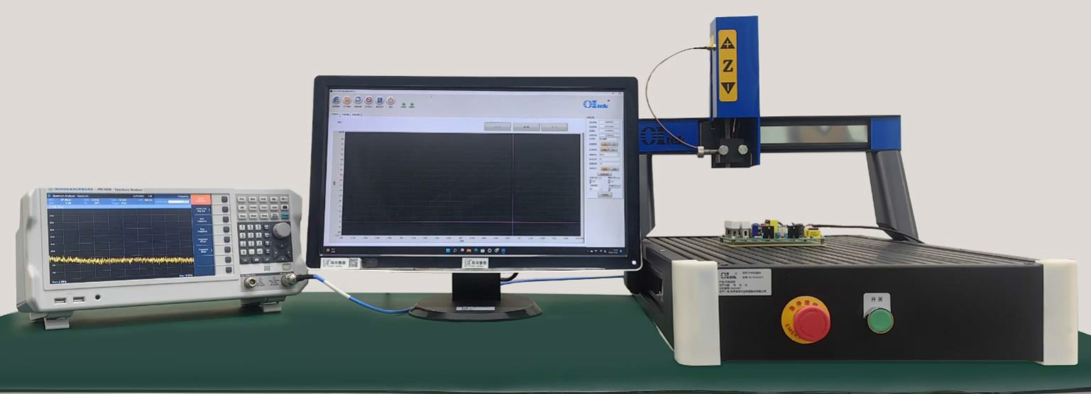 电磁干扰扫描仪(Electromagnetic interference scanner)又称 EMI扫描仪,是属于电磁兼容测试设备,具备干扰频谱分析、定频干扰成像功能。仪器主要由自动定位扫描模块、数据采集模块和自动分析软件三部分组成,通过自动定位装置携带传感器对 PCB板、小型电子设备、器件等产品进行表面电磁场强度逐点扫描,数据采集处理设备对电磁场数据进行记录,最终通过自动分析软件将电磁场强度数据予以修正后,再以彩色图像形式呈现被测产品表面的电磁干扰分布。