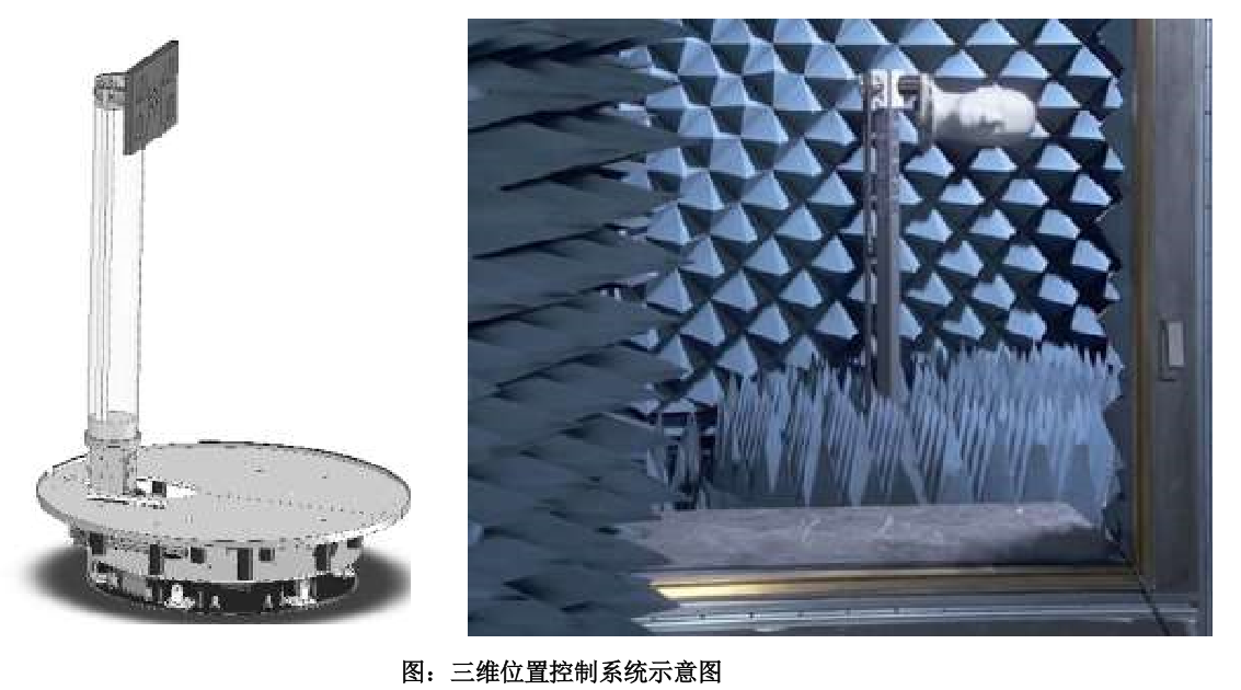 重型位置系统的承重负载为 11.3Kg, 两个轴的电机单元经过射频屏蔽处理,并被设计放置在吸波材料之下。通过光纤电机连接到定位控制器,这样防止了通过暗室屏蔽墙的射频干扰或者信号泄漏。 定位器可沿着 phi 轴和 Theta 均可实现连续旋转,方向角精度不小于 0.25 度,旋转速度 12o15o/s可调。定位器使用低介电材料,将反射降到最小。最小旋转步进为 0.1度